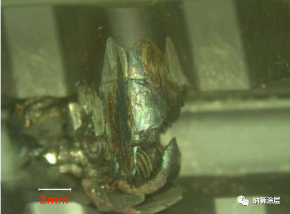 后刃面严重拉伤,一般为一层或两层复合剥落拉伤